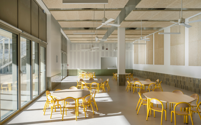 Labellisée E+C- (E3C1) et BDM (Bâtiments durables méditerranéens), l’ensemble accorde avec discrétion durabilité et sensibilité. Tandis que la pierre, avec ses reliefs naturels, tempère la chaleur et enveloppe l’école d’un climat d’apaisement, les façades vitrées, généreuses et lumineuses, laissent entrer la lumière du jour, favorisent la ventilation naturelle, et instaurent un dialogue intime entre intérieur et extérieur. L’école devient ainsi un sanctuaire respectueux de son environnement, un lieu où la pédagogie se mêle à la conscience écologique.
