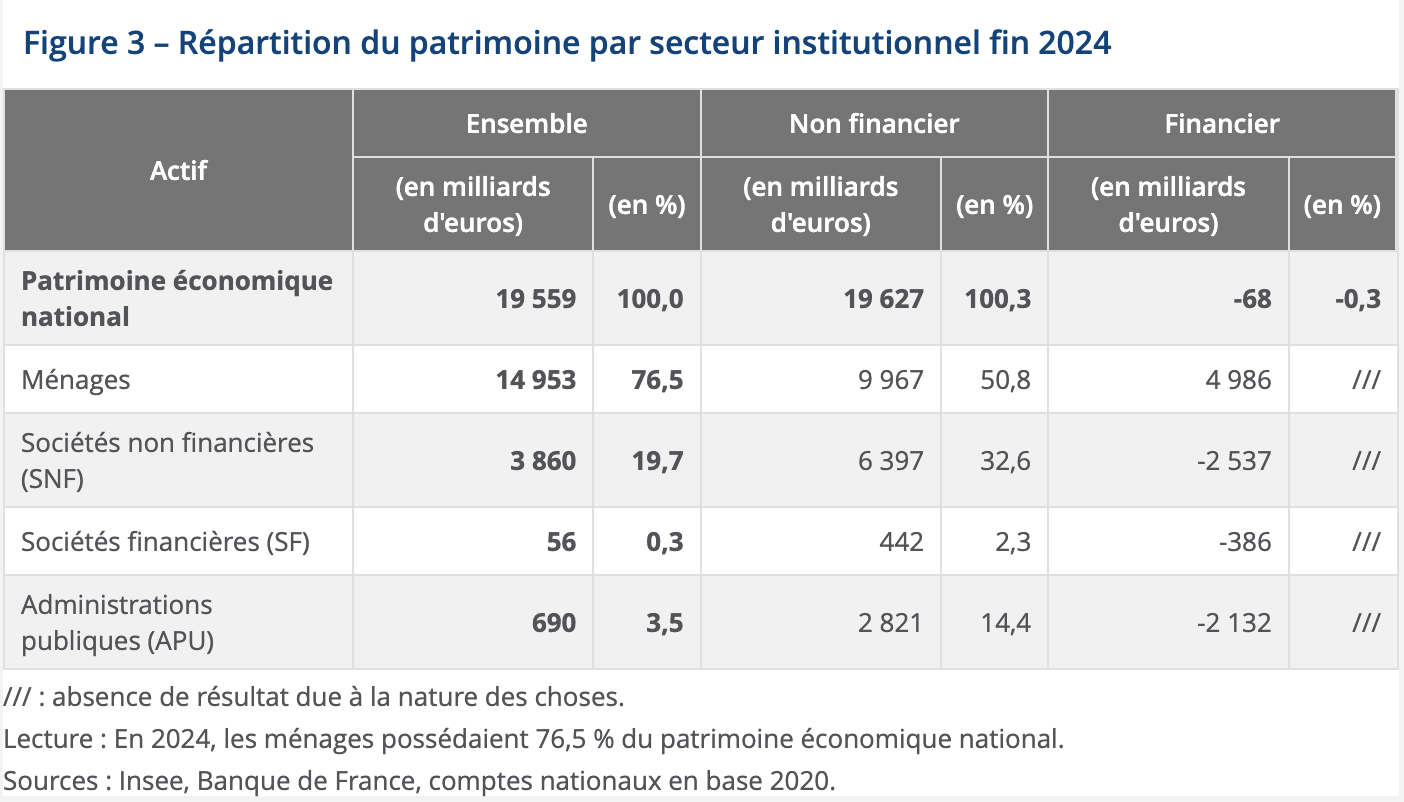 Une étude conjointe de l’Insee et de la Banque de France, publiée jeudi 6 novembre, révèle que le patrimoine des ménages français a progressé de 0,7 % en 2024, porté principalement par la hausse de leurs placements financiers. À la fin de l’année, il atteignait 14 953 milliards d’euros, dont plus de 60 % sont investis dans l’immobilier.