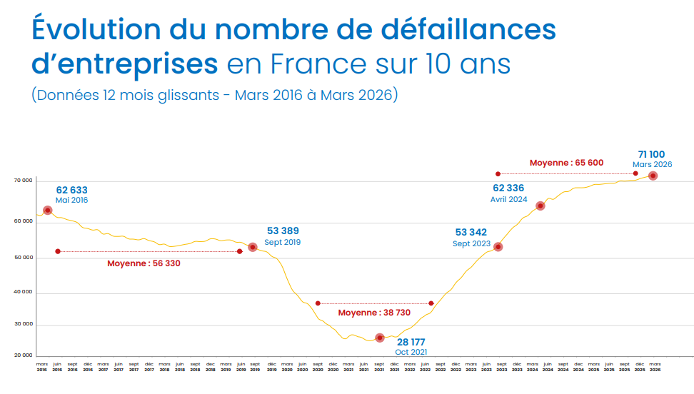 En 2025, près de 70 000 entreprises ont été concernées par des défaillances, selon Altares. Mais 2026 ne commence pas mieux, avec une hausse de 6,4 % des défaillances au T1, portant à presque 19 000 le nombre d'entreprises touchées.