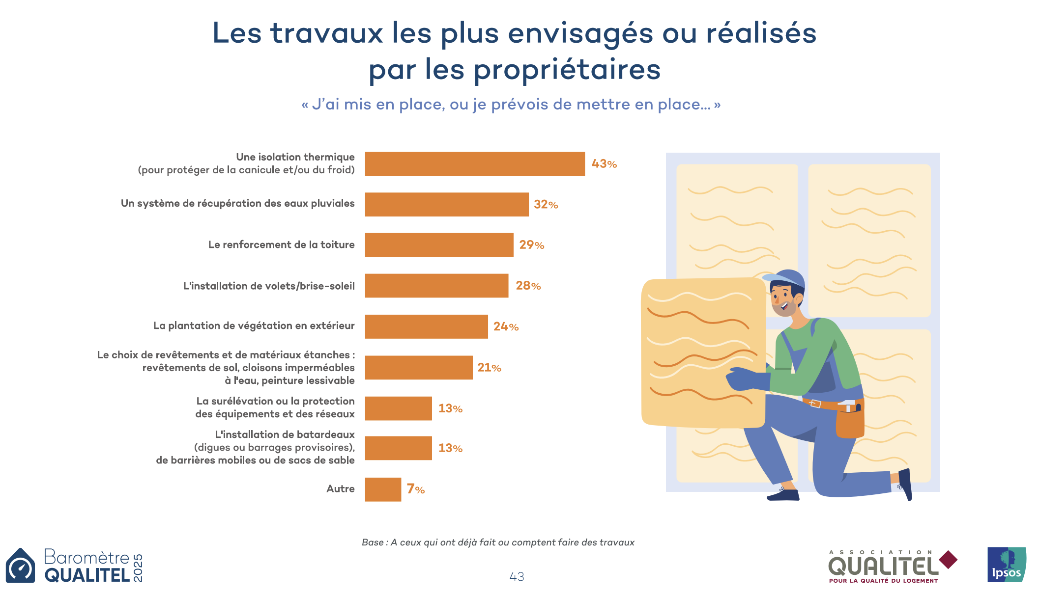 Parmi les travaux les plus envisagés, on retrouve l’isolation thermique pour protéger son logement de la chaleur et du froid, citée par 43 % des propriétaires.