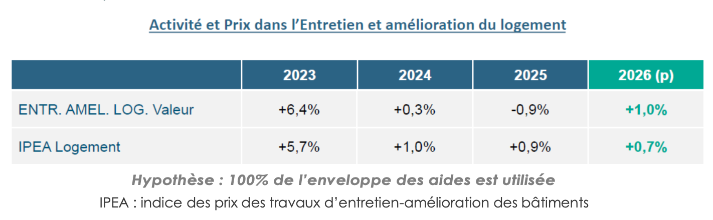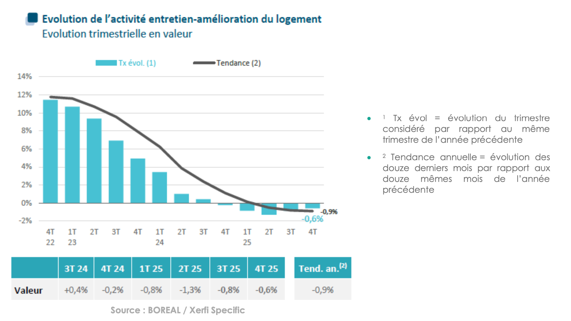 L’activité d’entretien-amélioration du logement a enregistré des baisses de -0,8 % au troisième trimestre et de -0,6 % au quatrième trimestre. En glissement annuel, la tendance s’établit à -0,9 %, traduisant « la poursuite d’une contraction toujours présente, mais modérée ».