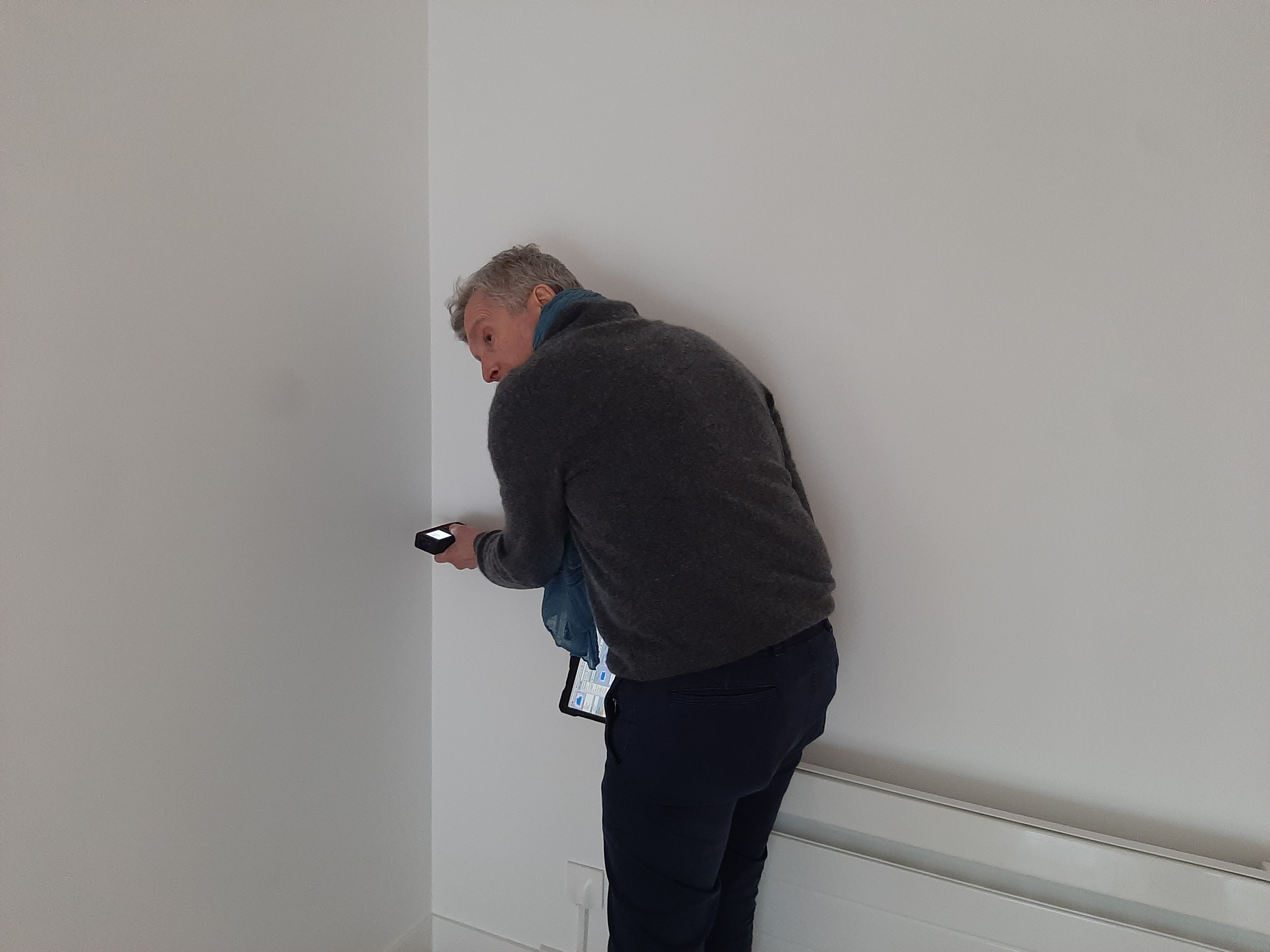 Après avoir mesuré la surface de l'appartement à l'aide d'un mètre laser « dont on vérifie l'étalonnage tous les ans », il vérifie l'installation électrique.
