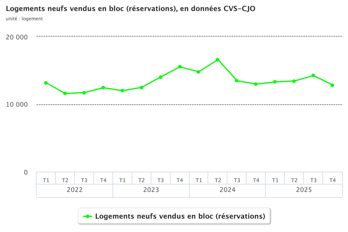 Le 20 février, les derniers chiffres de la commercialisation de logements neufs sont tombés. Le ministère de la Ville et du Logement estime à 15 536 le nombre d’unités réservées par des particuliers au quatrième trimestre 2025, en données corrigées des variations saisonnières et des jours ouvrables (CVS-CJO).