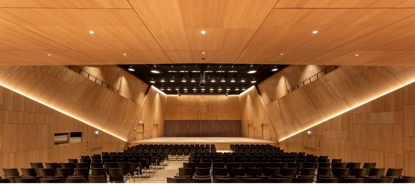 Ces plafonds associent un support en gypse à un placage en bois véritable, ce qui permet de conserver la chaleur et l’esthétique du bois, tout en garantissant une excellente réaction au feu et une très bonne qualité de l’air intérieur. L’acoustique est modulable selon les projets, grâce à des perforations ou à des voiles acoustiques. Ces solutions, souvent réalisées sur mesure, s’adressent à des lieux emblématiques comme des auditoriums, des bâtiments publics ou des bureaux de direction.