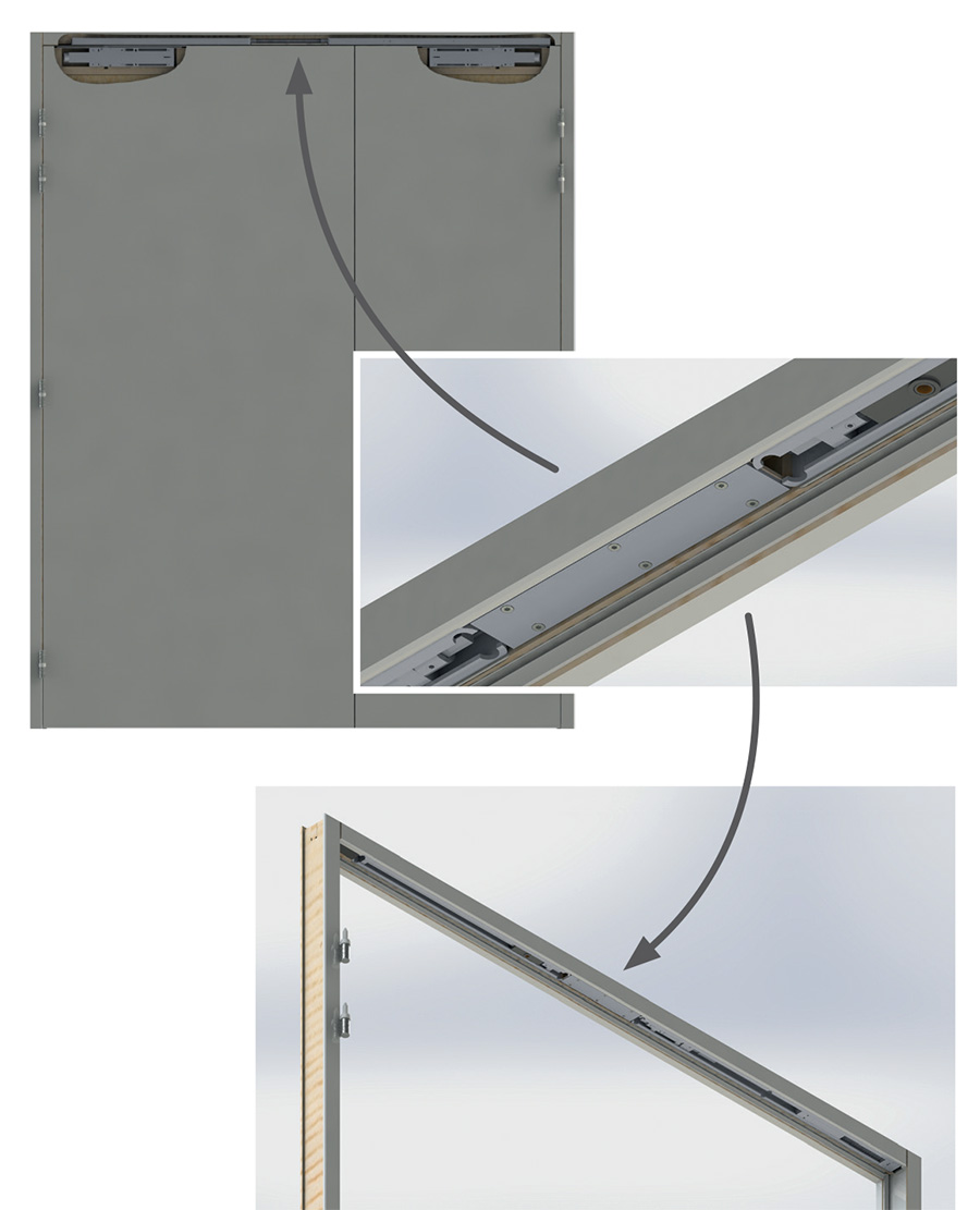 En version DAS, le Multigenius conserve cette logique d’invisibilité même dans les situations complexes : les systèmes d’asservissement — habituellement volumineux et en applique — sont eux aussi encastrés dans la traverse de l’huisserie, préservant un niveau d’esthétique équivalent à celui des portes standard.