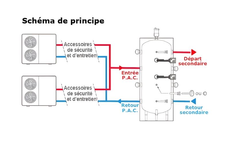 Le principe consiste à séparer hydrauliquement la production de chaleur et les circuits de distribution, tout en offrant une réserve d’eau permettant d’amortir les variations de fonctionnement des générateurs. Cette configuration contribue à limiter les cycles courts et à améliorer la régulation globale du système.