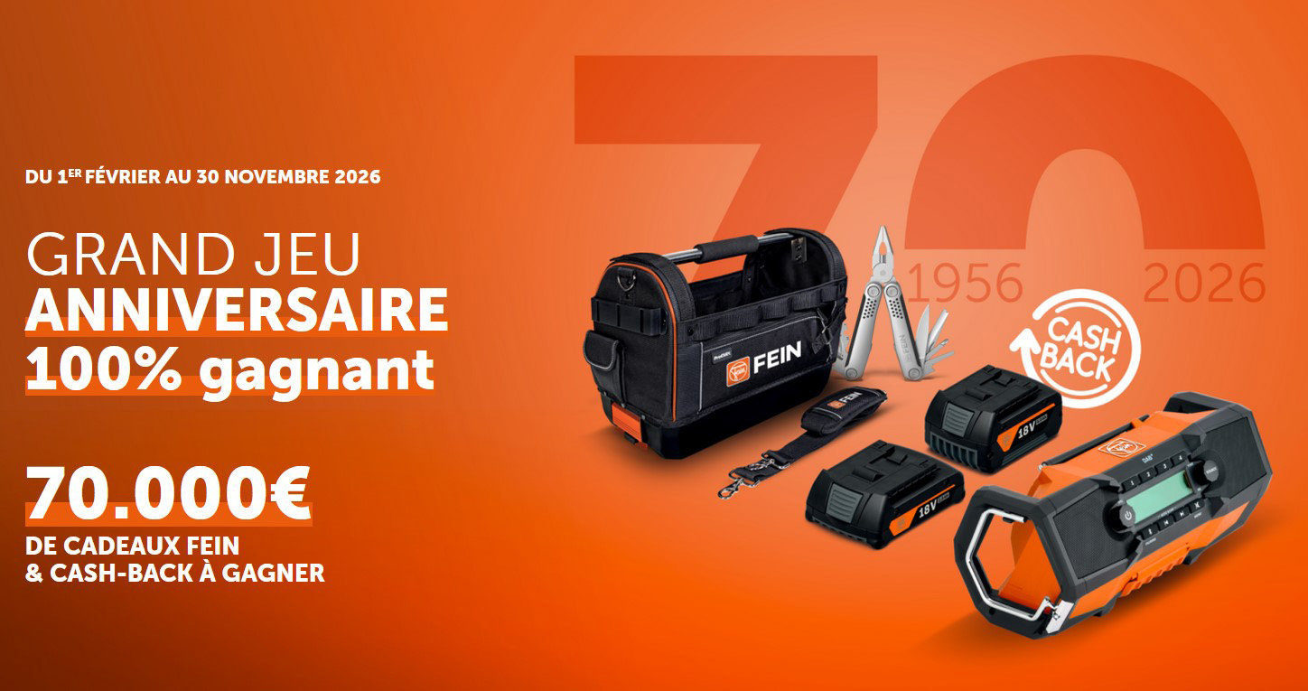 Du 1er février au 30 novembre 2026, FEIN propose une opération de cashback exceptionnelle. Pour chaque achat d'une machine FEIN, les clients pourront bénéficier d'un remboursement allant de 40 à 75 €. Cette initiative vise à remercier nos clients pour leur fidélité tout en incitant à découvrir nos produits.