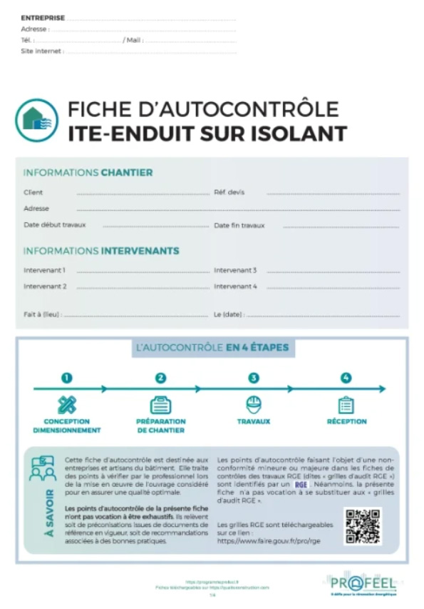→ Fiche d’autocontrôle : une checklist de plus de 40 points à vérifier, notamment les points de contrôle RGE, offrant un appui simple et concret pour assurer la qualité à chaque étape.