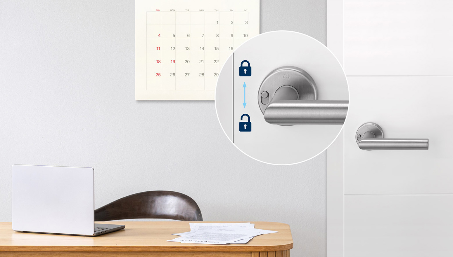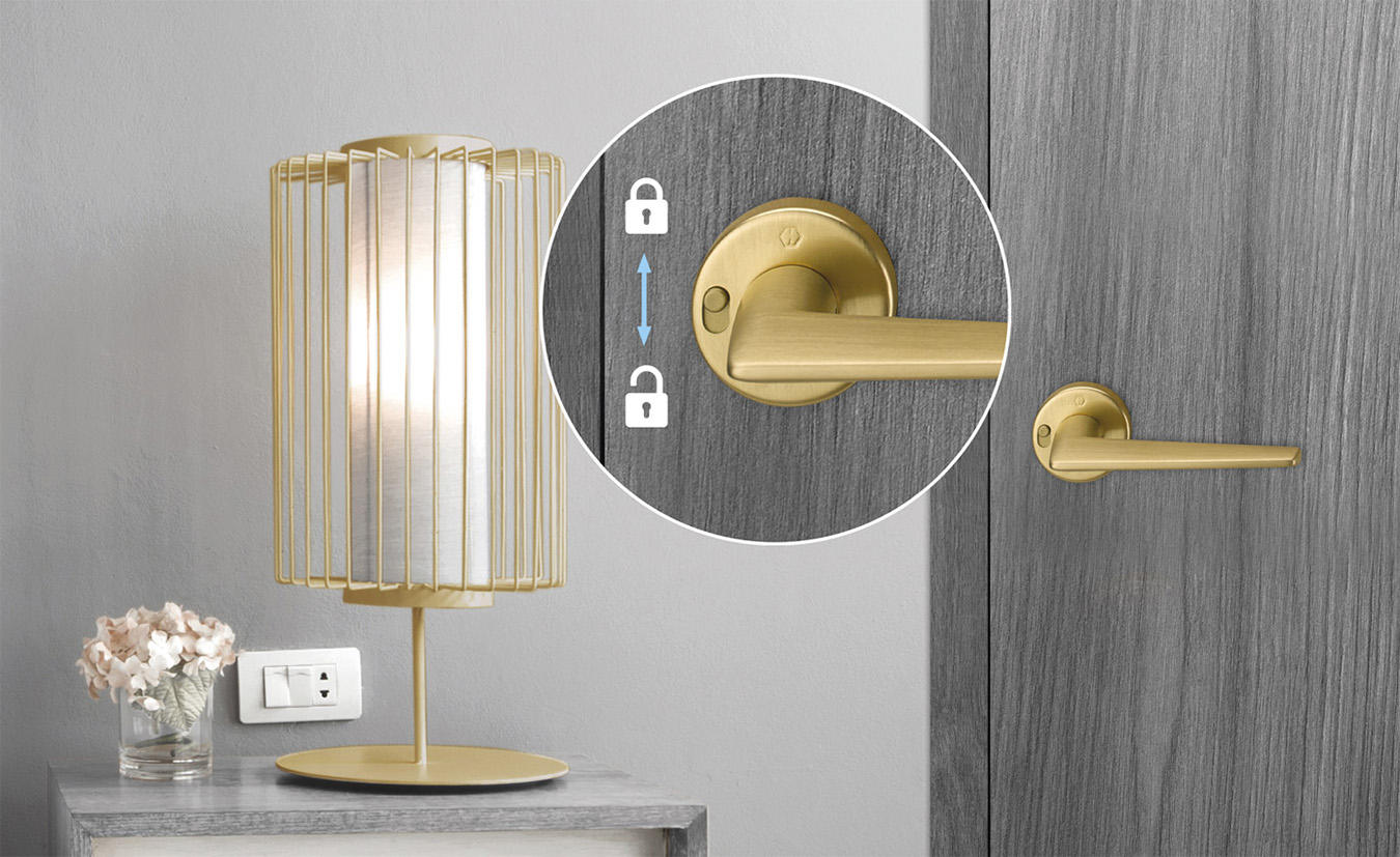 Avec son mécanisme de verrouillage intégré directement dans la rosace, MiniLock permet de verrouiller la porte d’un simple geste, grâce à un discret bouton coulissant parfaitement intégré au design de la poignée.