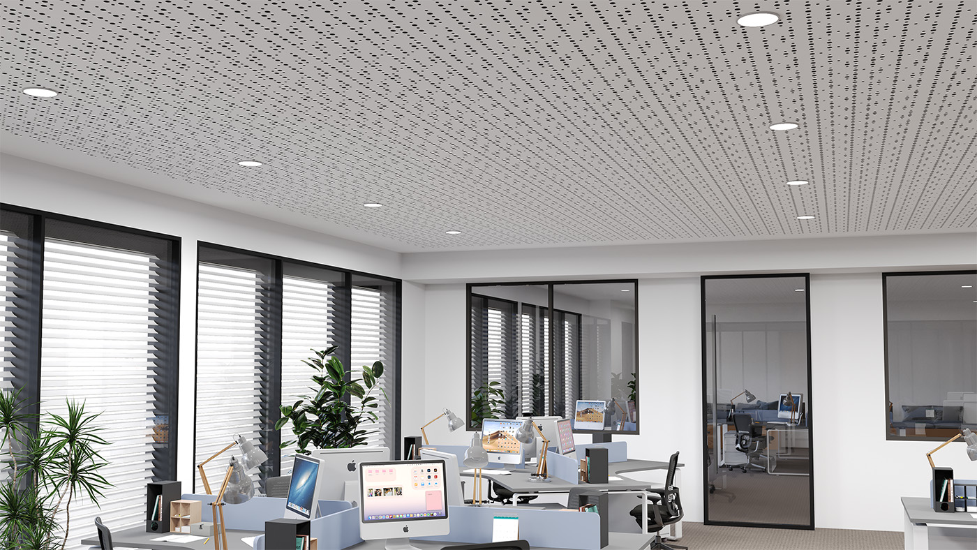 Grâce à leurs perforations spécifiquement travaillées, les plaques offrent une absorption acoustique performante jusqu’à 0,70 αw, répondant aux besoins des espaces recevant du public ou favorisant la concentration.