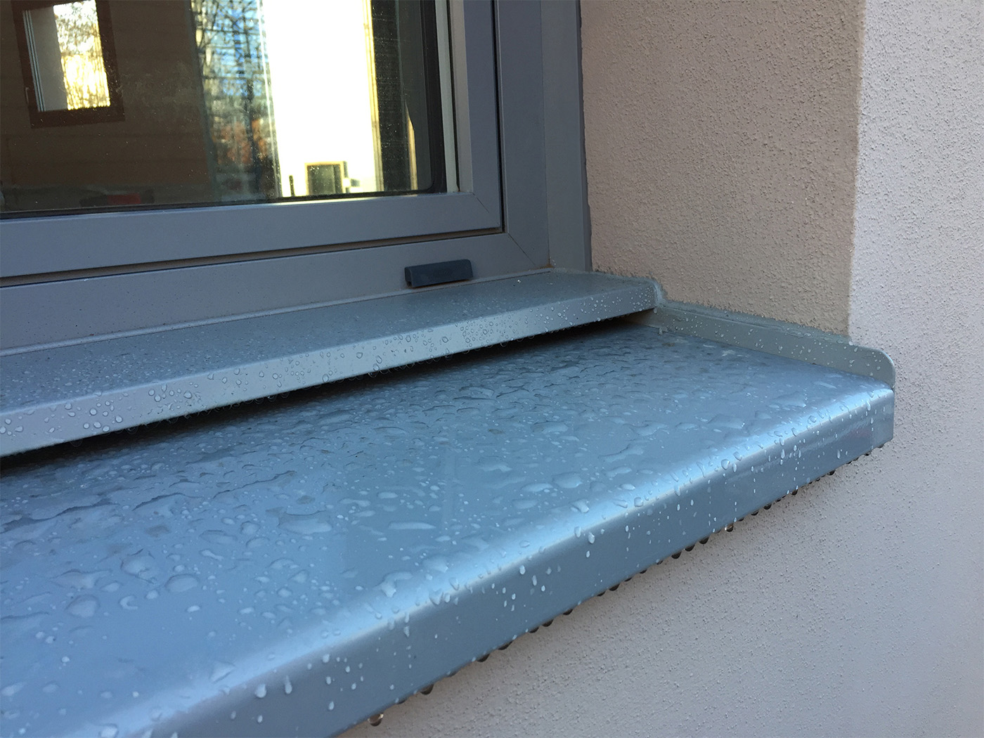 Son profil en pente, ses bords arrondis et ses cannelures assurent une évacuation optimale des eaux pluviales, évitant ainsi les infiltrations et les salissures en façade.