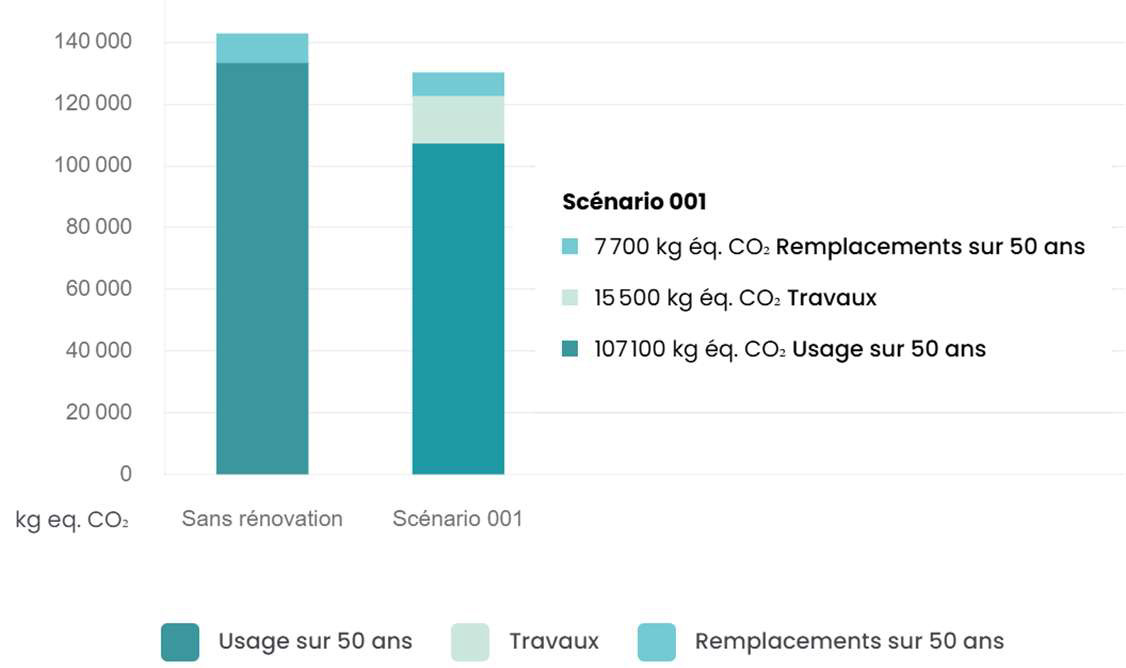En l’absence de règles conventionnelles d’analyse de cycle de vie en rénovation, la durée de vie du bâtiment retenue dans l’outil est de 50 ans.