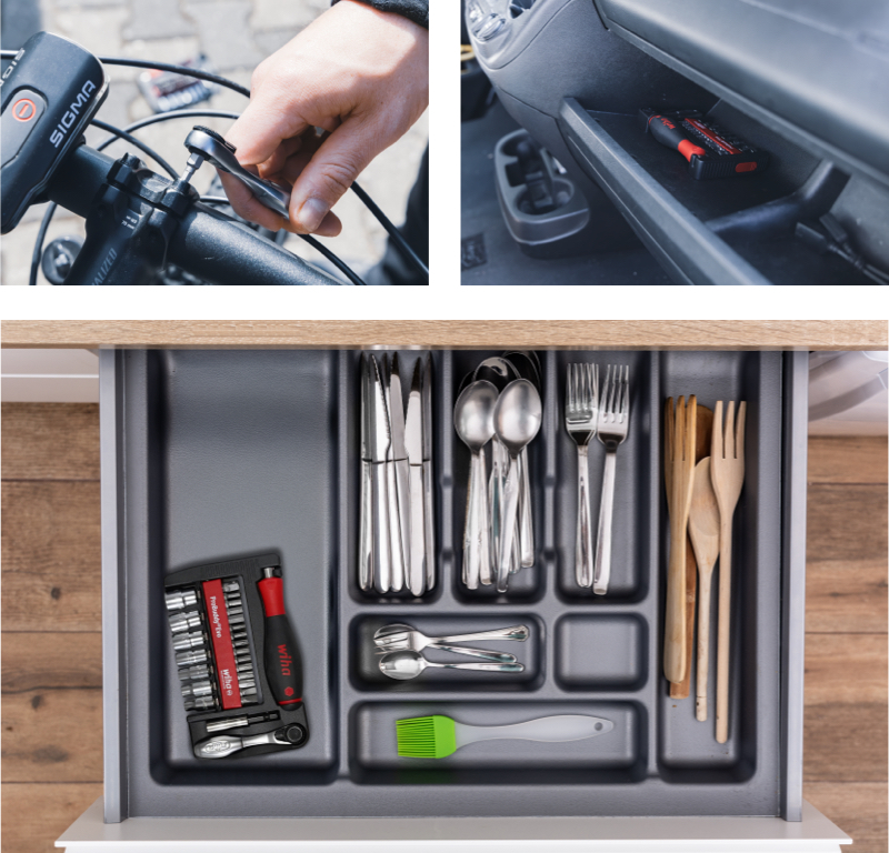 À l'intérieur, le kit offre une combinaison polyvalente de composants de haute qualité : 29 embouts pour diverses applications, sept douilles courantes de 1/4 pouce, une mini-clé à cliquet réversible à 72 dents pour les travaux dans des espaces confinés, ainsi qu'un porte-embouts magnétique et un adaptateur. Le kit est complété par un manche de tournevis SoftFinish® qui garantit un travail particulièrement ergonomique et ménageant les mains. Grâce à des matériaux de haute qualité tels que l'acier au chrome-vanadium et une surface résistante et facile à nettoyer, le kit résiste également aux conditions difficiles.