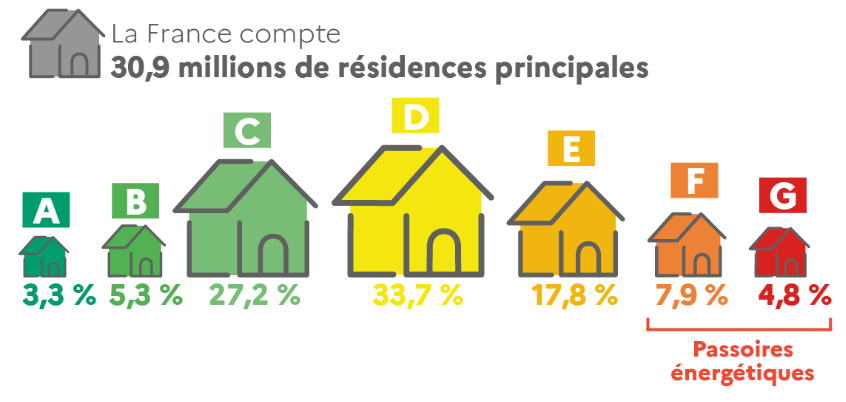 Pour rappel, les logements classés sous l'appellation de « passoires énergétiques » sont très énergivores. Ils sont classés F ou G au DPE et représentent 14,4 % du parc total de logements français. Parmi les résidences principales, 12,7 % sont des passoires énergétiques, soit 3,9 millions de logements.