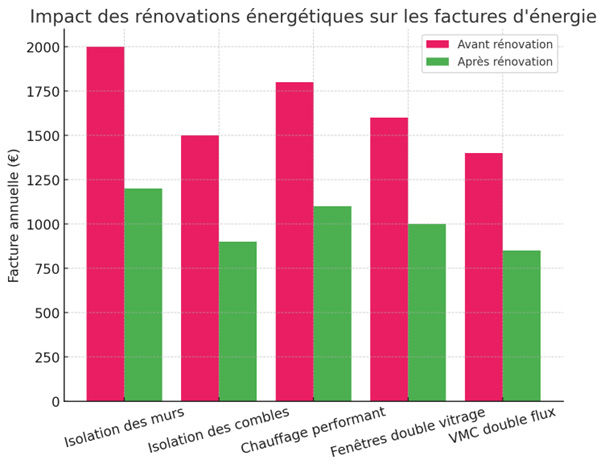 Réaliser des travaux de rénovation énergétique permet de réduire considérablement les dépenses en énergie. Voici l'impact moyen des différentes rénovations sur les factures annuelles :