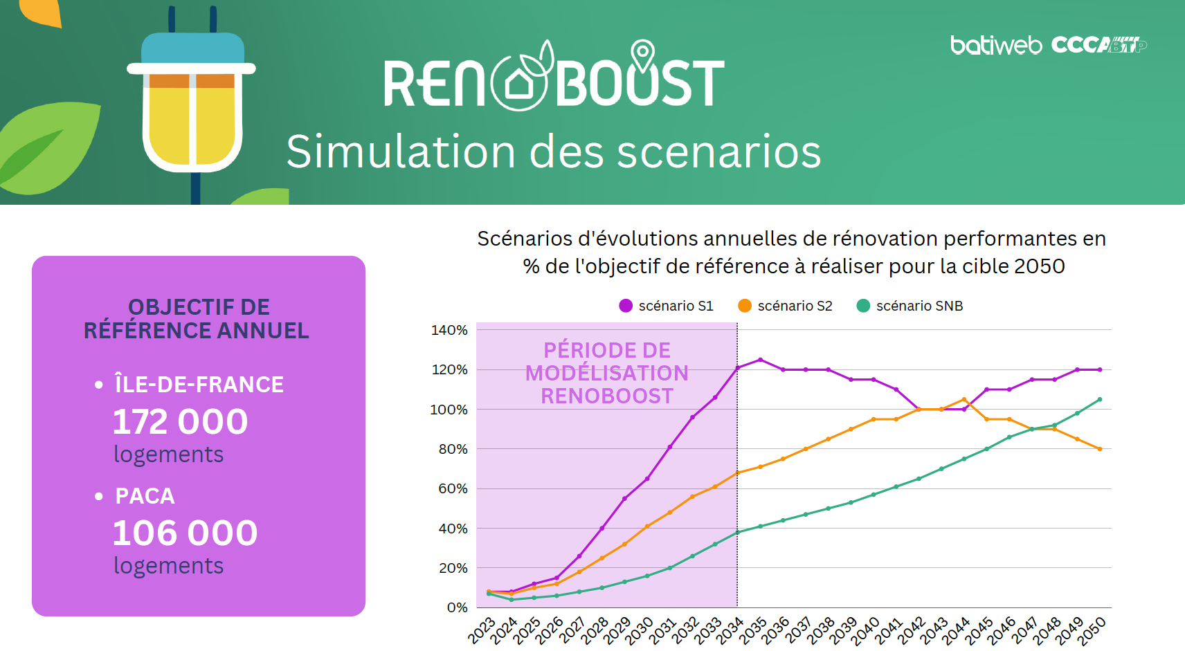 En parallèle, le programme Renoboost a permis de dessiner trois grands scénarios de la rénovation énergétique. Le premier : massifier pour changer l’étiquette D ou E à celle B ou C. Deuxième scénario : remédier aux problèmes de passoires thermiques (F ou G) pour les faire passer à une étiquette B ou C.