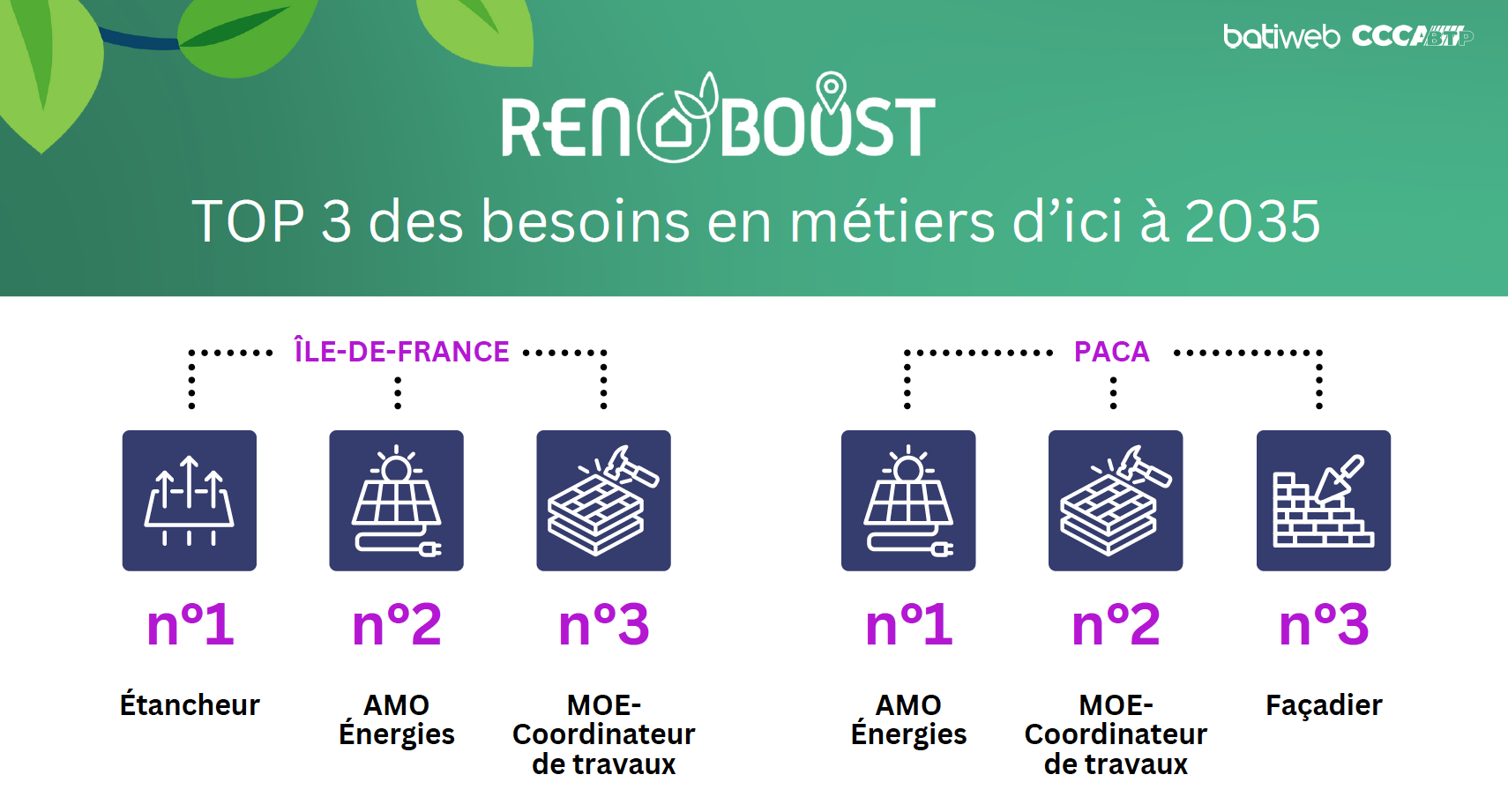 Entre ces deux régions, les top 3 des métiers nécessaires varient également. Dans le territoire francilien, les étancheurs, assistants à la maîtrise d’ouvrage (AMO) énergie et coordinateurs de travaux sont davantage sollicités.
