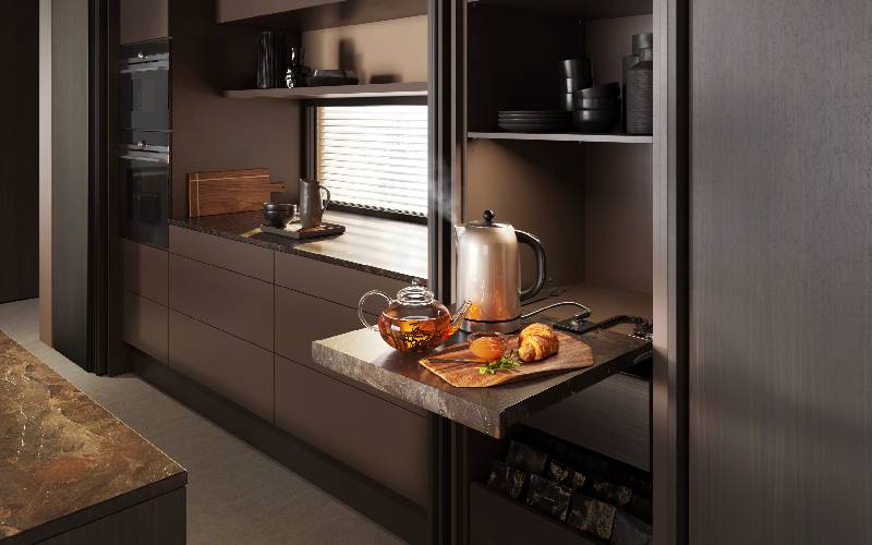 La prise intégrée permet de dissimuler en toute facilité et sans perte d’espace des appareils électriques dans des tiroirs ou des tablettes. Les plans de travail restent ainsi libres et le temps des enchevêtrements de câbles est désormais révolu.