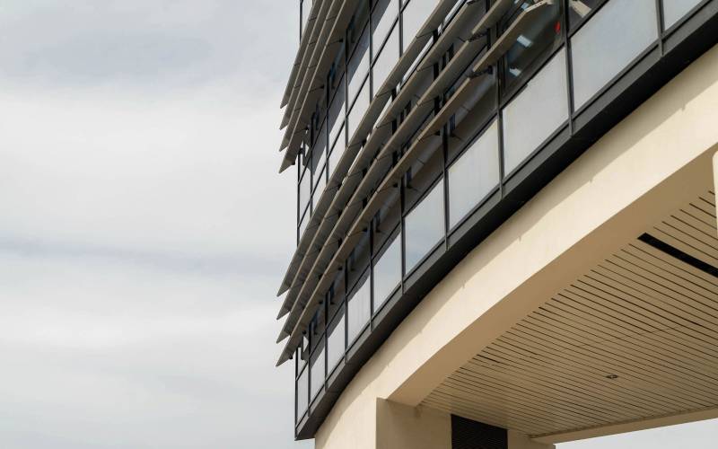 Protection solaire avec lame rectangulaire. DucoSun Cubic est un brise-soleil architectural très moderne et esthétique grâce aux lames rectangulaires.