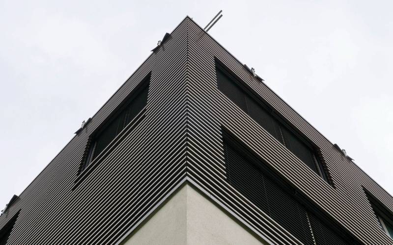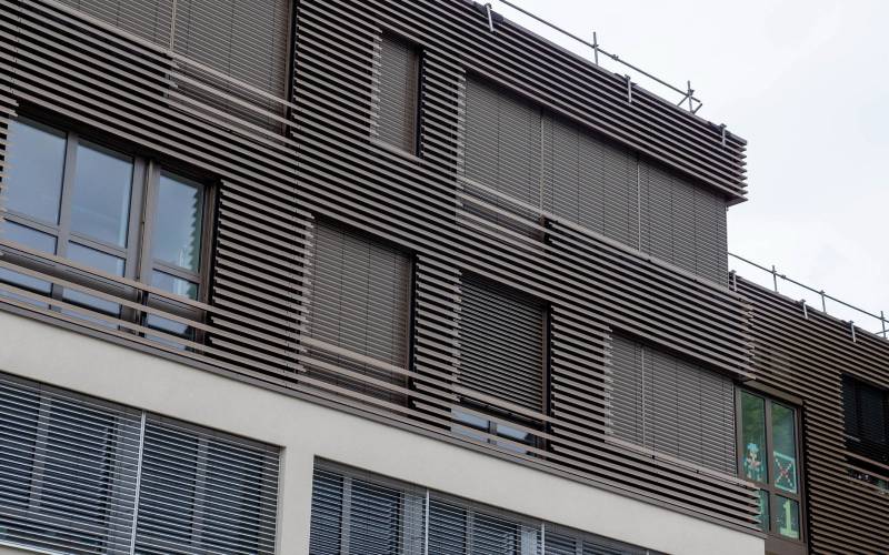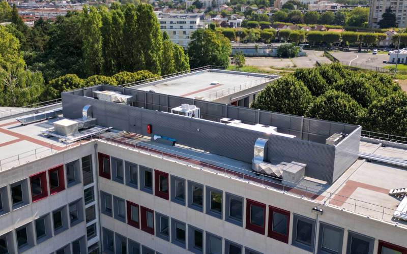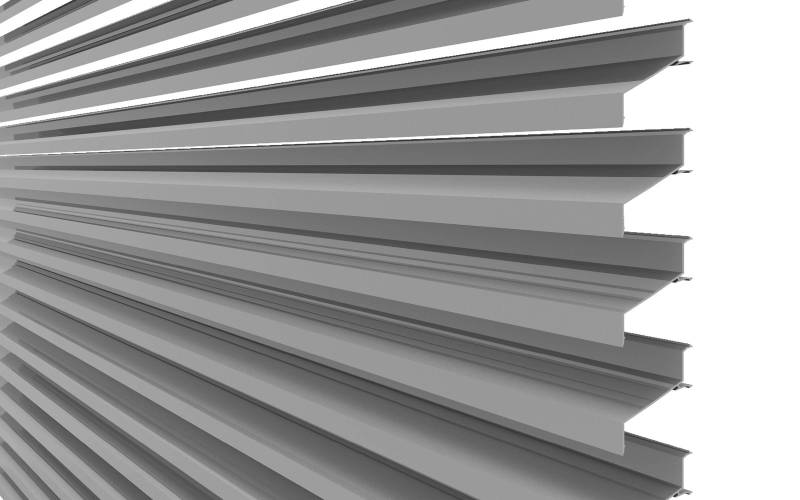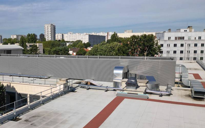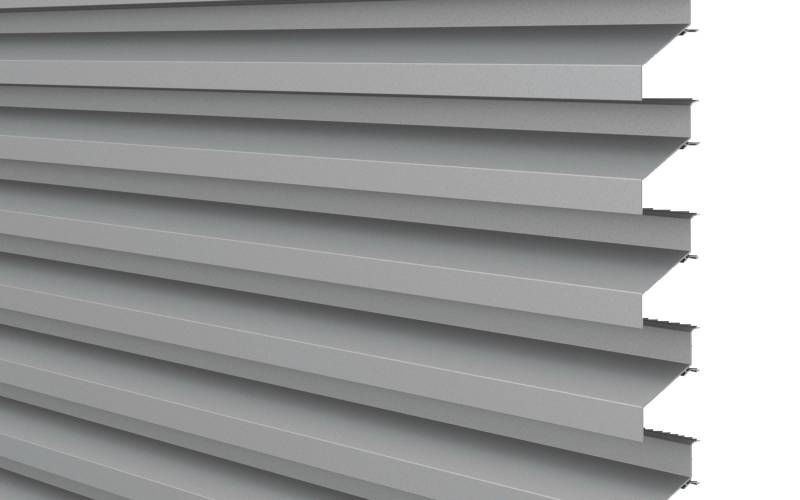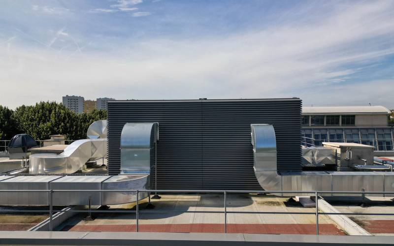 Bardage à ventelles aluminium à grandes lames inclinées, permettant de masques les zones techniques d’un bâtiment.