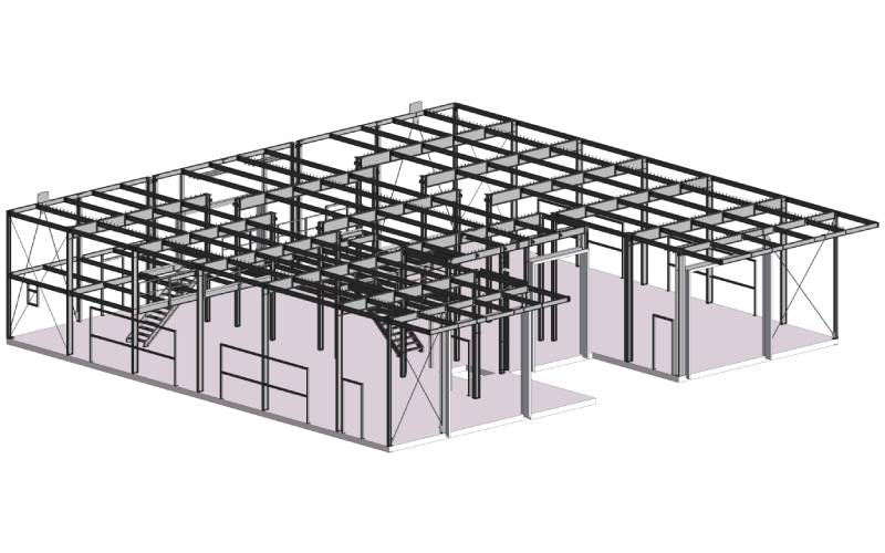 - Modélisation acier complète : profils laminés ou pliés, tubes, tôles, platines, raidisseurs, cornières, garde-corps.