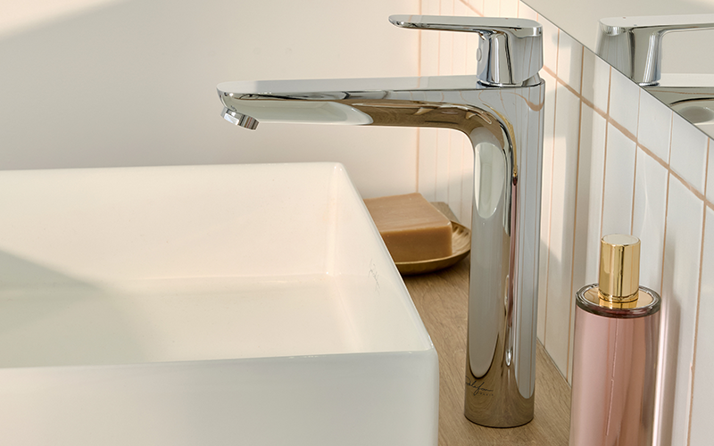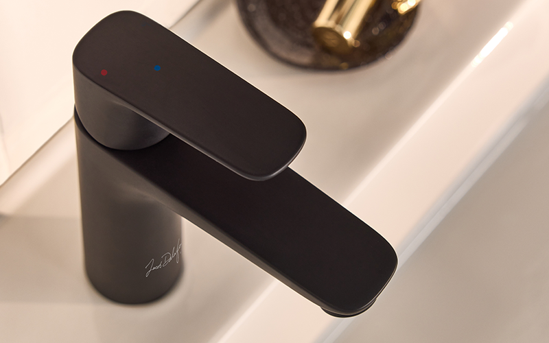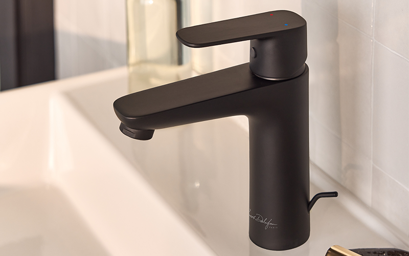 La robinetterie July+ se réinvente pour apporter un design contemporain sans compromis sur l'économie d'eau et d'énergie avec son ouverture eau froide et son débit limité à 5L/min.