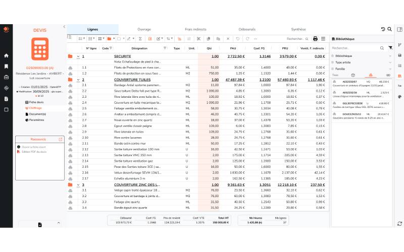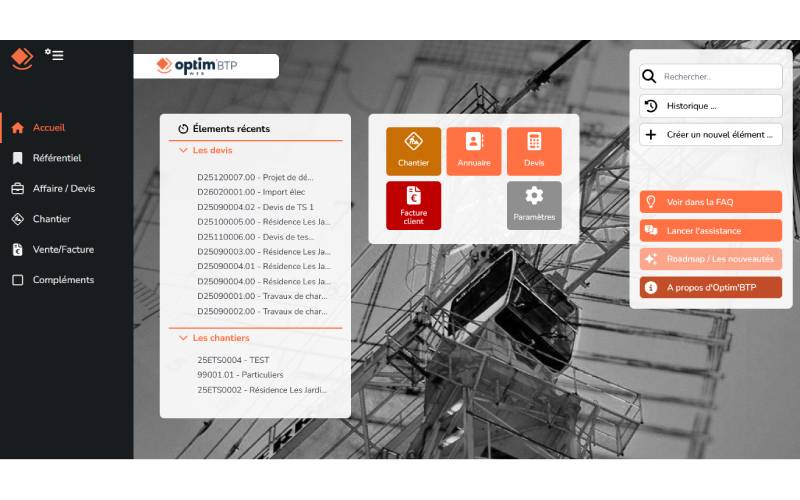 Avec Optim'BTP Web, la nouvelle solution 100 % en ligne, vous centralisez votre gestion BTP où que vous soyez. Accessible depuis n'importe quel support connecté, elle garantit simplicité, rapidité de prise en main et une vision en temps réel de vos projets. Son interface intuitive vous permet de gagner en efficacité, d'améliorer la rentabilité de vos chantiers et de maîtriser vos marges