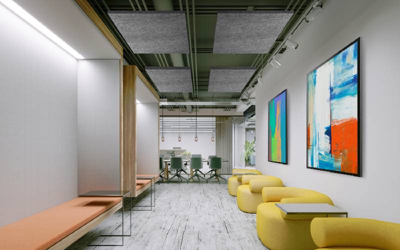 L’installation des panneaux en îlots suspendus peuvent également contribuer à redessiner l’espace et rompre la linéarité du bâtiment avec des panneaux de différentes formes et couleurs.